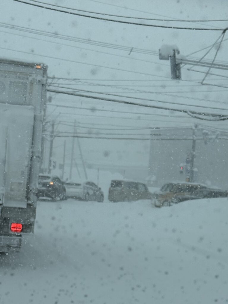 幹線道路も脇道も除雪が追いついておらず、実質的に車線が一つ減っているような状態だ。